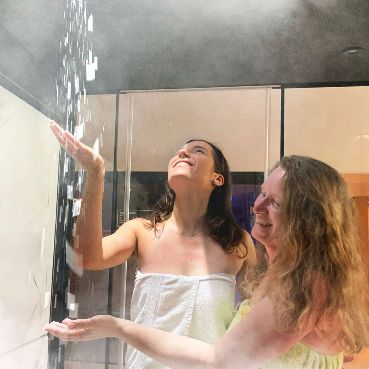 Ideal zur Abkühlung nach dem Saunagang, bietet die Schneedusche ein Erlebnis für alle Sinne: Feinster, trockener Pulverschnee stimuliert den Kreislauf, erfrischt den Körper und sorgt für wohltuende, belebende Regeneration.